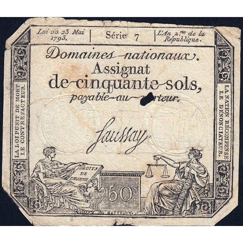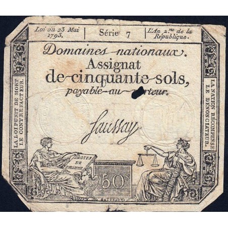 • Assignat 42a - 50 sols - 23 mai 1793 - Série 7 - Filigrane royal - Etat : B+