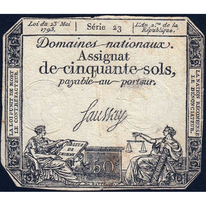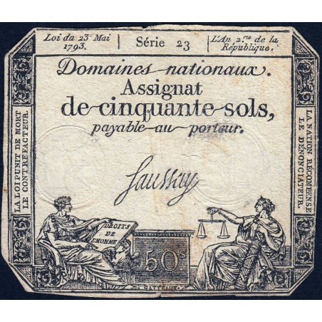 • Assignat 42a - 50 sols - 23 mai 1793 - Série 23 - Filigrane royal - Etat : TB