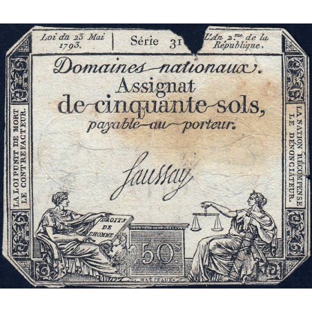 • Assignat 42a - 50 sols - 23 mai 1793 - Série 31 - Filigrane royal - Etat : AB