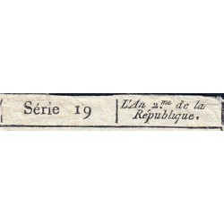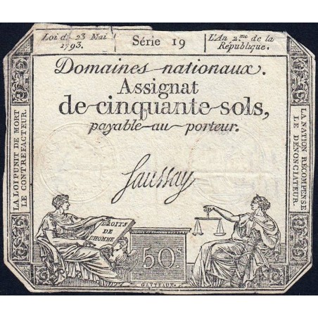 • Assignat 42a-v1 (variété) - 50 sols - 23 mai 1793 - Série 19 - Filigrane royal - Etat : TB
