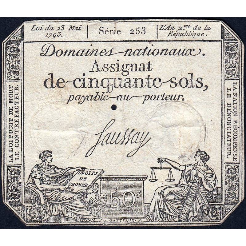Assignat 42b - 50 sols - 23 mai 1793 - Série 253 - Filigrane républicain - Etat : TB