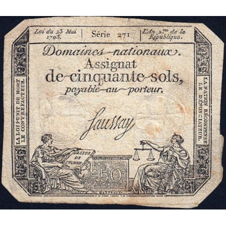 • Assignat 42b - 50 sols - 23 mai 1793 - Série 271 - Filigrane républicain - Etat : B+