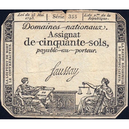• Assignat 42b - 50 sols - 23 mai 1793 - Série 355 - Filigrane républicain - Etat : B+