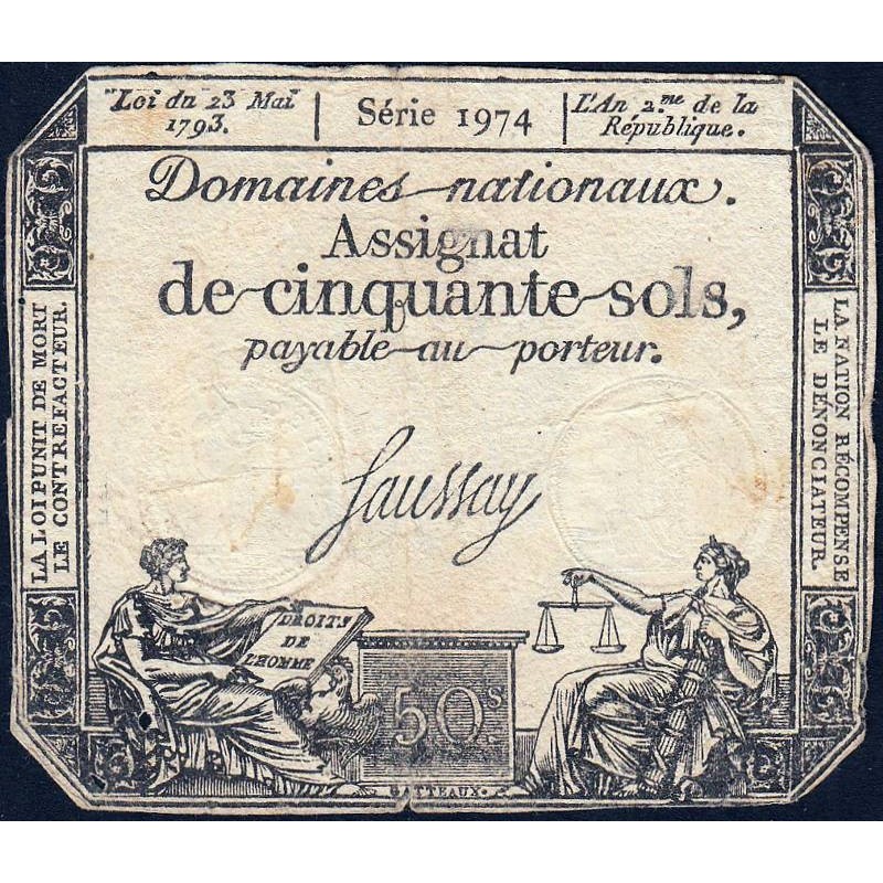 • Assignat 42b - 50 sols - 23 mai 1793 - Série 1974 - Filigrane républicain - Etat : TB-