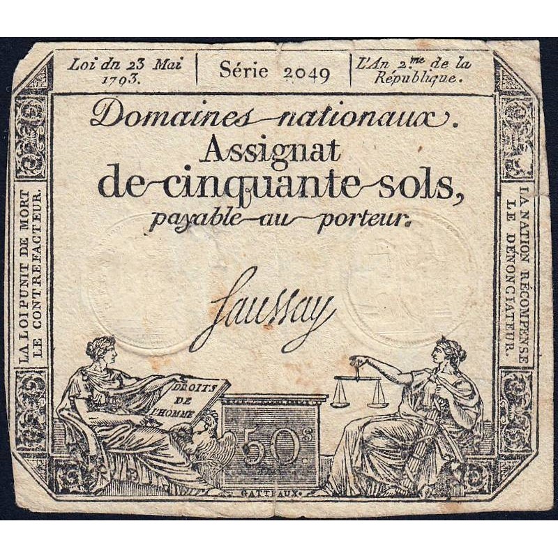 Assignat 42b - 50 sols - 23 mai 1793 - Série 2049 - Filigrane républicain - Etat : TB