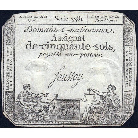 Assignat 42c - 50 sols - 23 mai 1793 - Série 3381 - Filigrane républicain - Etat : TB+