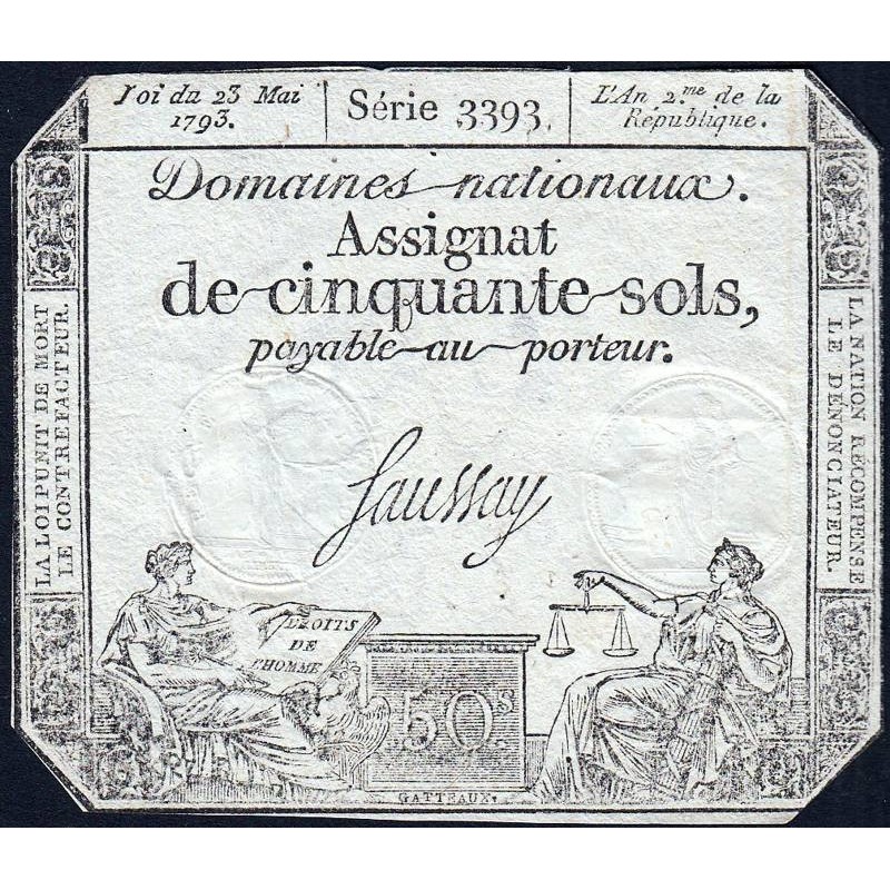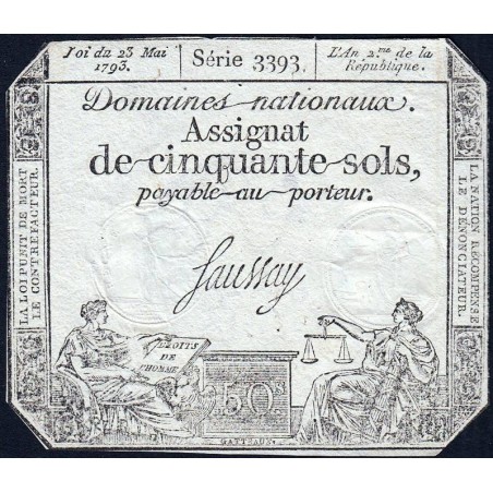 Assignat 42c - 50 sols - 23 mai 1793 - Série 3393 - Filigrane républicain - Etat : TTB