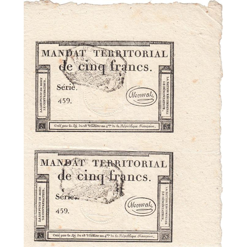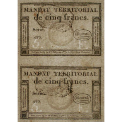 Paire mandat territorial 63b - 5 francs - 28 ventôse an 4 - Série 459 - Etat : SUP+