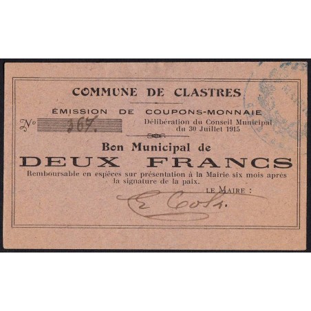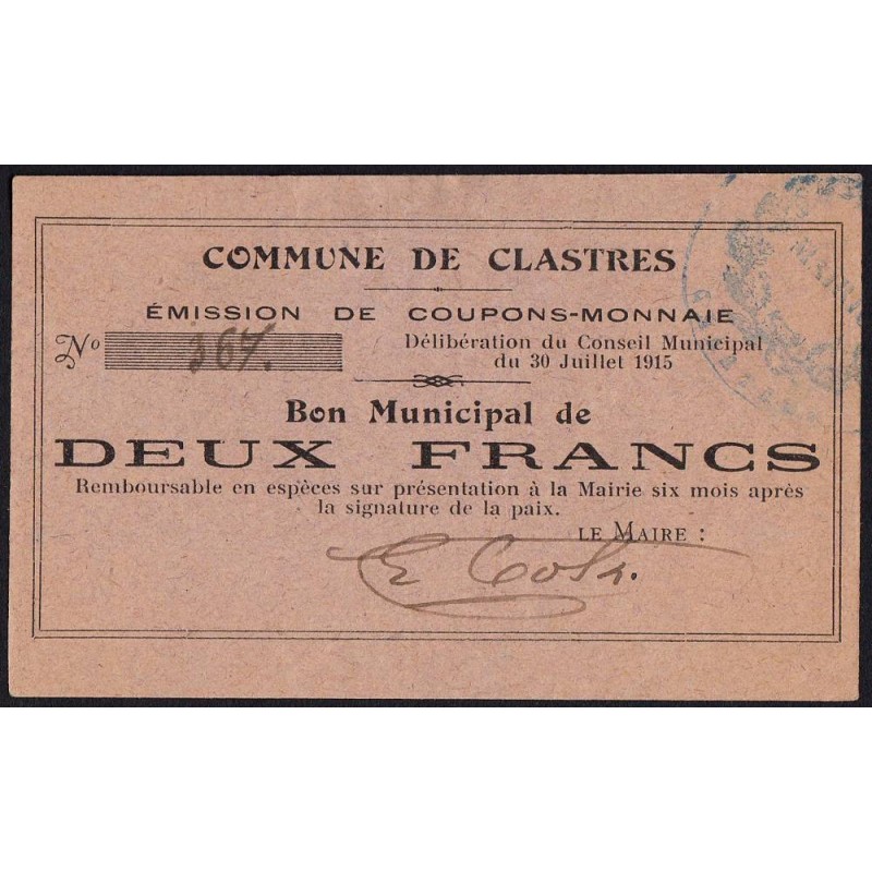 02 - Clastres - Commune - 2 francs - 30/07/1915 - Etat : SUP