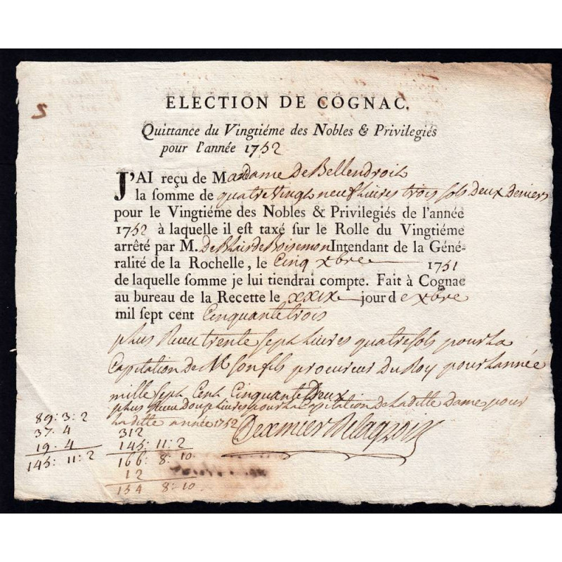Charente - Cognac - Louis XV - 1752 - Vingtième des Nobles - 89 livres - Etat : SUP