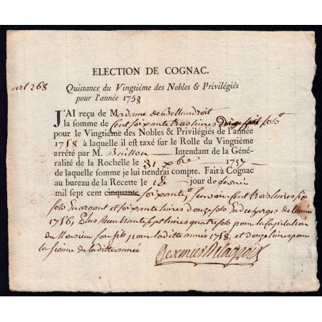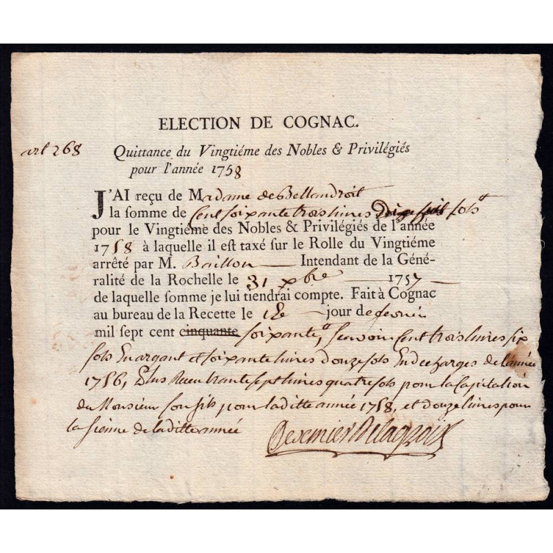 Charente - Cognac - Louis XV - 1758 - Vingtième des Nobles - 163 livres - Etat : SUP