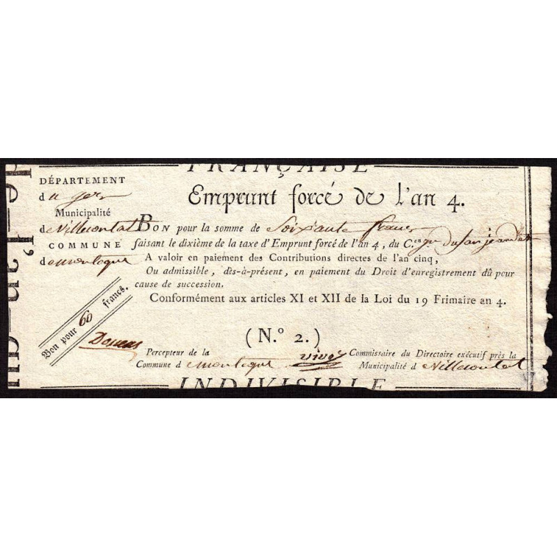 • Gers - Montegut - Révolution - 1795 - Emprunt forcé de l'an IV - 60 francs - Etat : SUP
