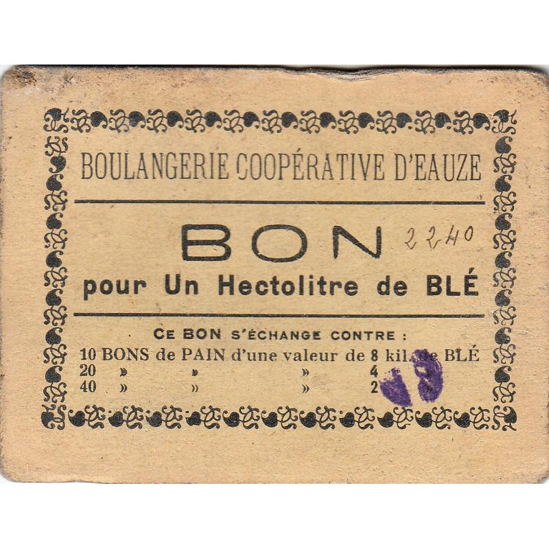 32 - Eauze - Boulangerie Coopérative - Bon pour 1 hectolitre de blé - Type 5 - Etat : TB+