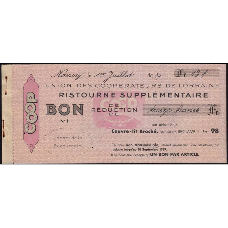54 - Nancy - Union des Coopérateurs de Lorraine - Bon - 13 francs - 1939 - Etat : SUP