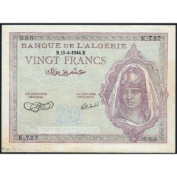 Aperçu rapide Algérie - Pick 92a_2 - 20 francs - Série K.737 - 15/04/1944 - Etat : TTB+ à SUP 35,00 € RUPTURE
