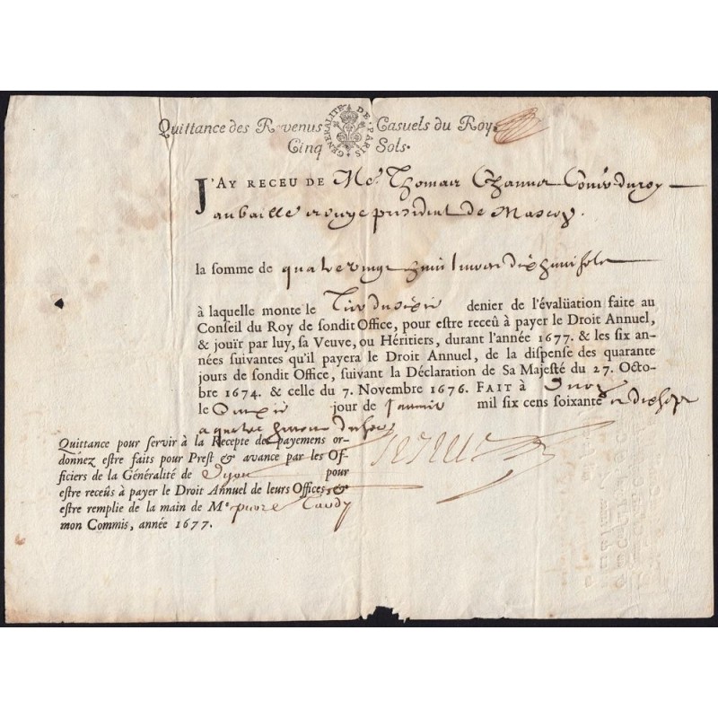 • Saône-et-Loire - Mâcon - Louis XIV - Revenus casuels 1677 - 88 livres - Etat : TTB