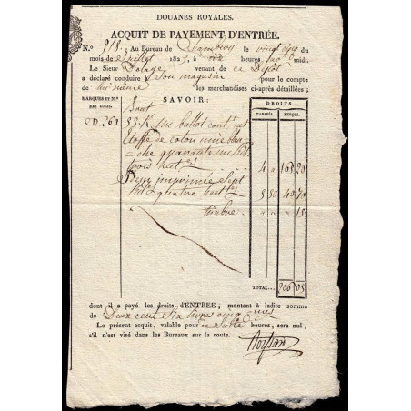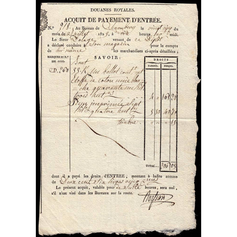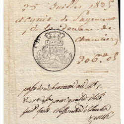 Duché de Savoie - Chambéry - 25/07/1825 - Droit de douane - 200 livres et 5 centimes - Etat : SUP