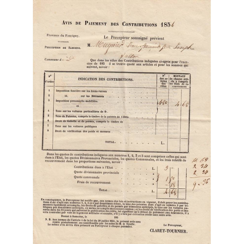 Paiement des Contributions 1856
