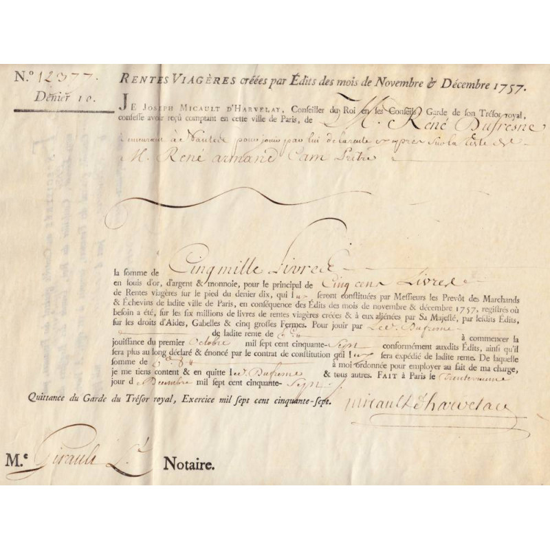 • Emprunt royal de 1757 et reçu signé par Joseph MICAULT D'HARVELAY