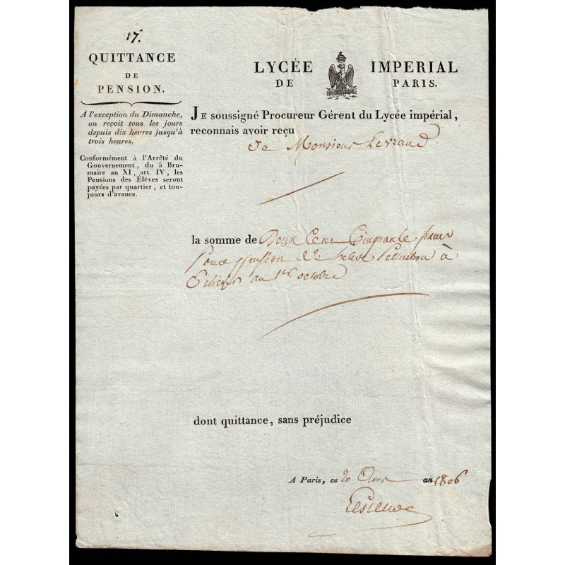 • Paris - 1er empire - 1806 - Quittance Lycée Impérial - 250 francs - Etat : SUP