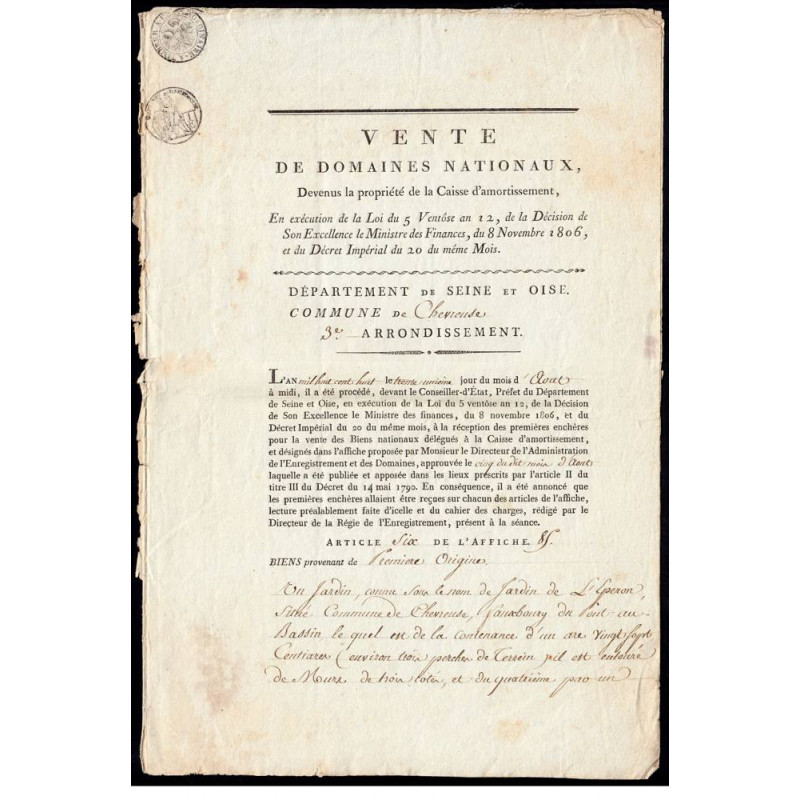 Yvelines - Chevreuse - 1er empire - Vente domaines nationaux - Etat : TTB