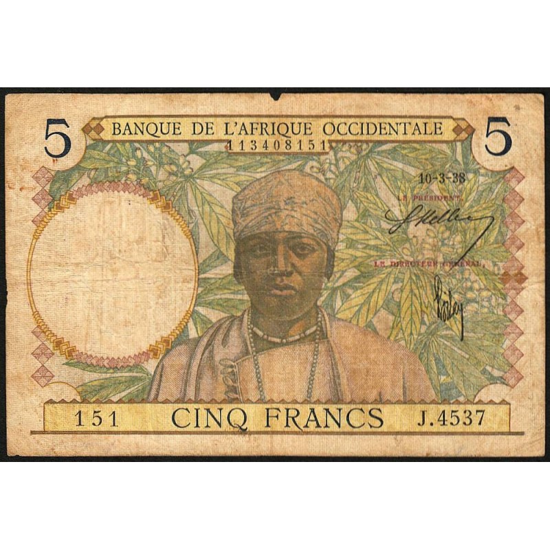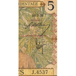 AOF - Pick 21_b3 - 5 Francs - Série J.4537 - 10/03/1938 - Etat : B