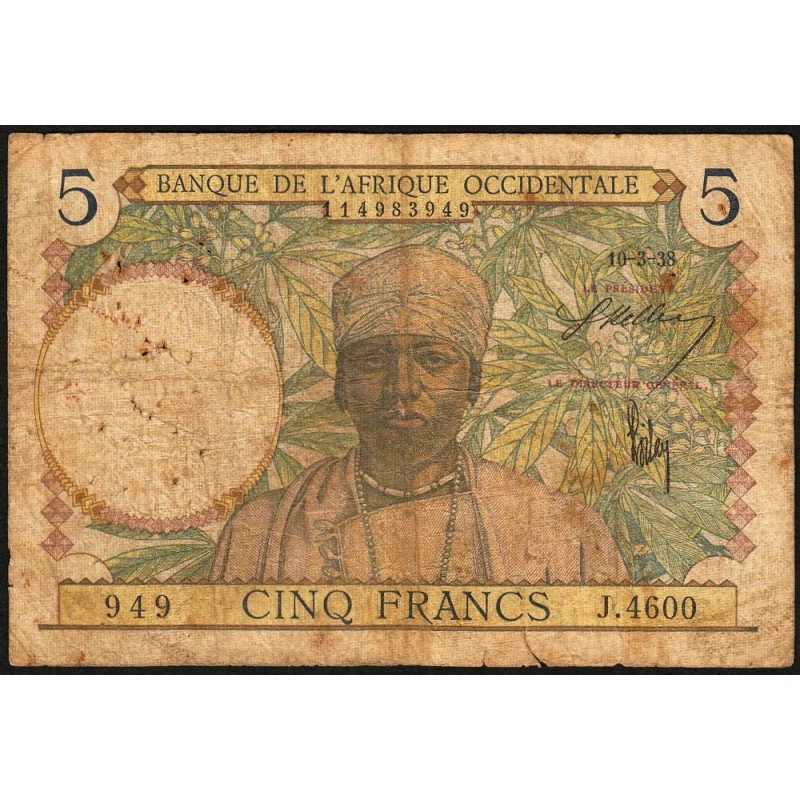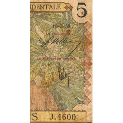 AOF - Pick 21_b3 - 5 Francs - Série J.4600 - 10/03/1938 - Etat : B-