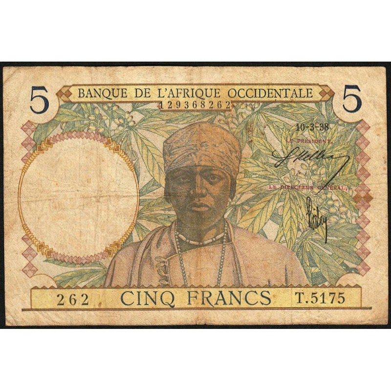 AOF - Pick 21_b3 - 5 Francs - Série T.5175 - 10/03/1938 - Etat : B+
