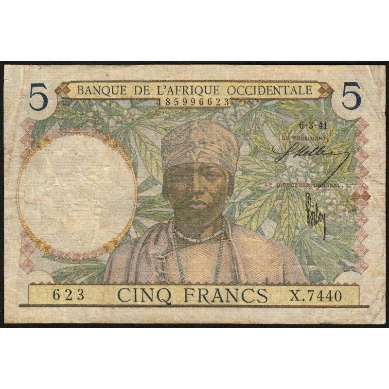 AOF - Pick 21_b5 - 5 Francs - Série X.7440 - 06/03/1941 - Etat : TB-