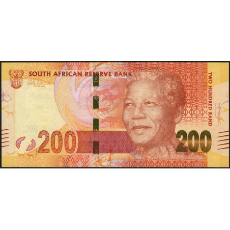Avers : Emblème du pays, portrait de Nelson Mandela (1918-2013) président de 1994 à 1999, chiens et groupe de chasseurs avec lance