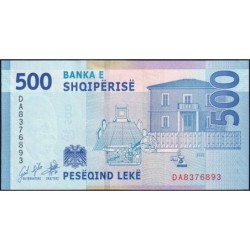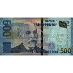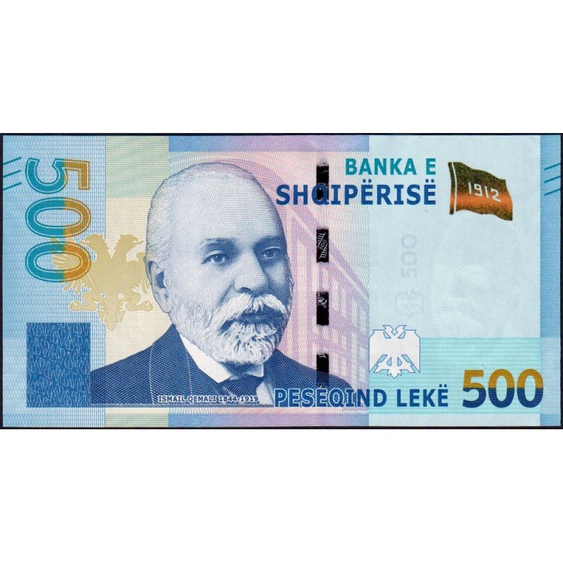 Avers : Portrait d'Ismail Qemali (1844-1919) principal chef du mouvement national albanais et fondateur de l'État albanais moderne, aigle bicéphale héraldique, contour du bâtiment de la banque d'Albanie à Tirana, drapeau avec la date de l'indépendance
