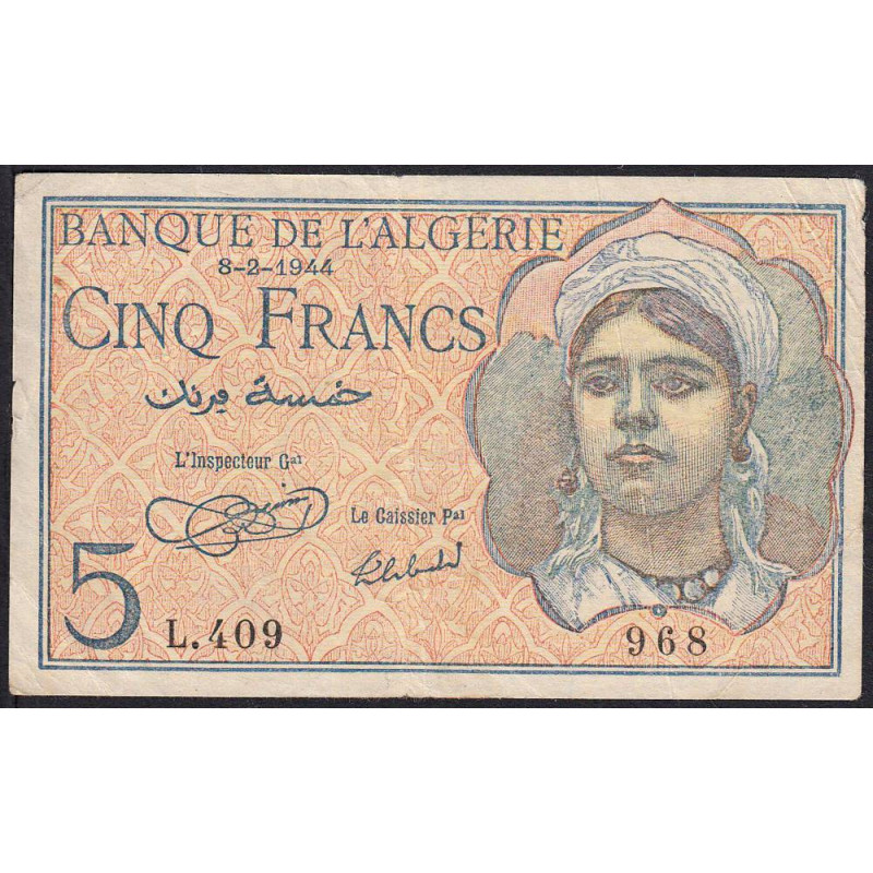 • Algérie - Pick 94a - 5 francs - Série L.409 - 08/02/1944 - Etat : TTB