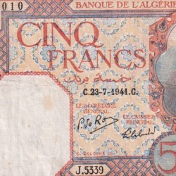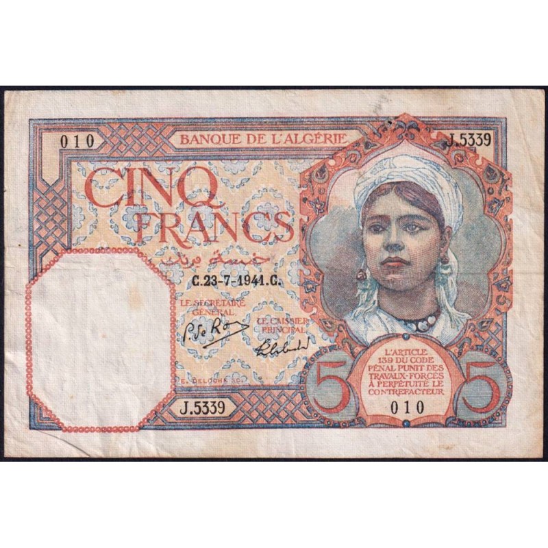 • Algérie - Pick 77b - 5 francs - Série J.5339 - 23/07/1941 - Etat : TB