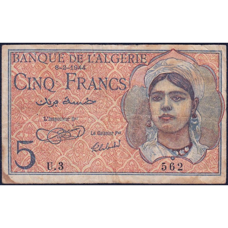 • Algérie - Pick 94a - 5 francs - Série U.3 - 08/02/1944 - Etat : TB-