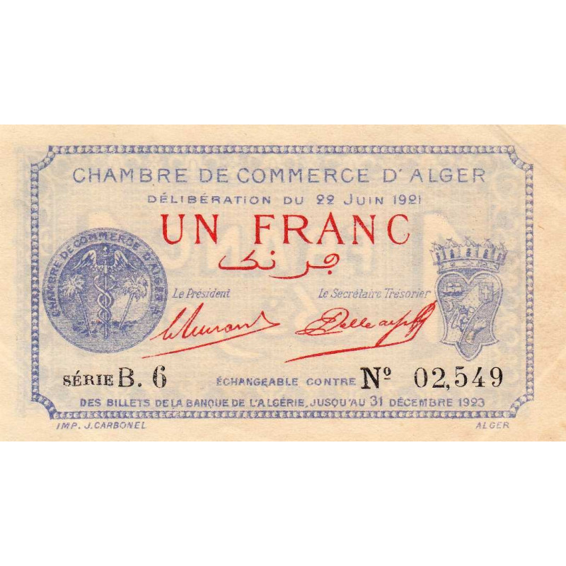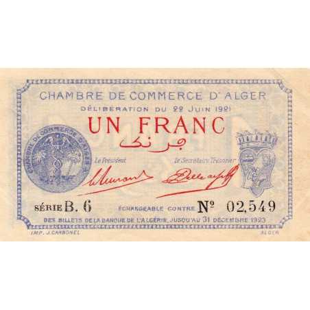 Algérie - Alger 137-18 - 1 franc - Série B.6 - 22/06/1921 - Etat : SPL+