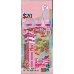 Revers : Tour de la place du Festival à Nassau, bateaux dans le port de Nassau, pont Sir Sidney Poitier à Nassau, bateau de croisière, armoiries des Bahamas à gauche