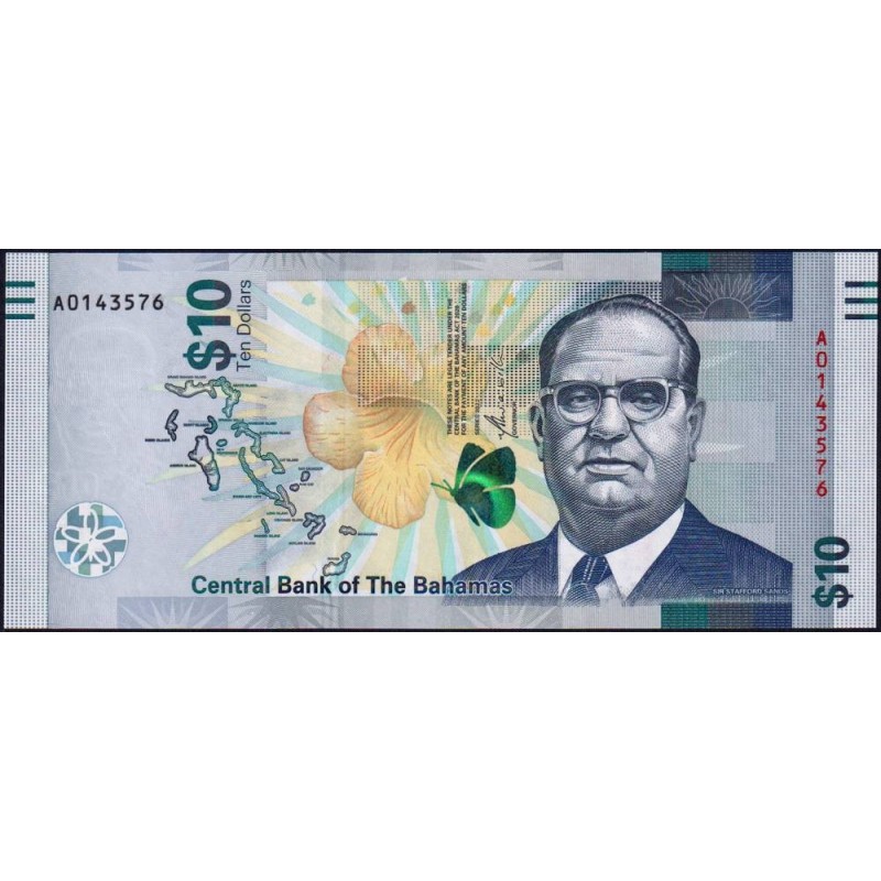 Avers : Portrait de l'ancien Ministre des Finances Sir Stafford Lofthouse Sands (1913-1972), carte des Bahamas à gauche, fleur de trompette d'or au centre