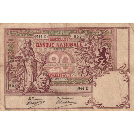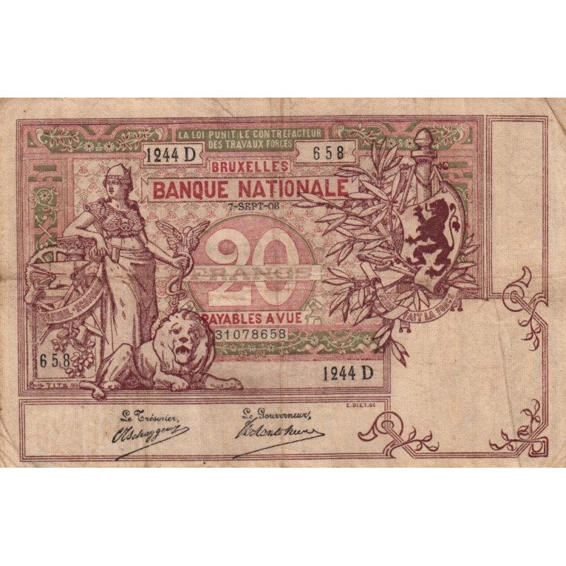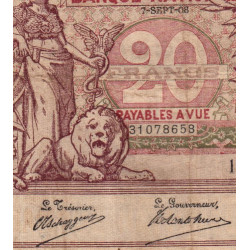 Belgique - Pick 62d - 20 francs - 07/09/1908 - Etat : TB+