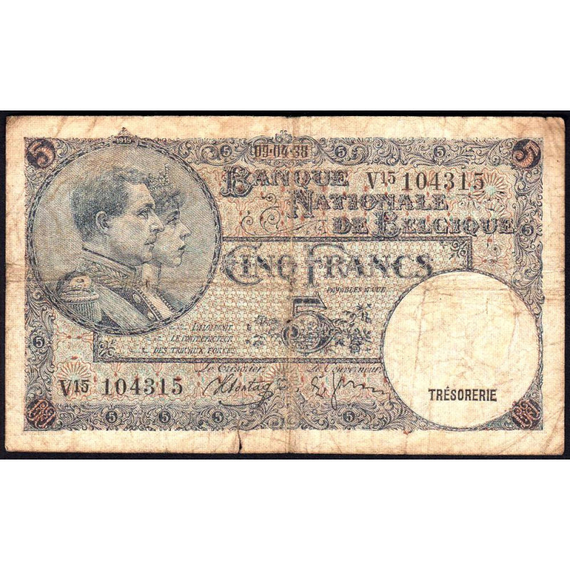• Belgique - Pick 108a - 5 francs - 09/04/1938 - Etat : B+