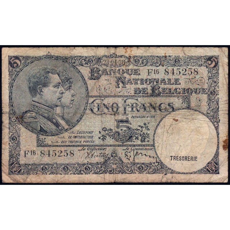 • Belgique - Pick 108a - 5 francs - 09/04/1938 - Etat : TB-