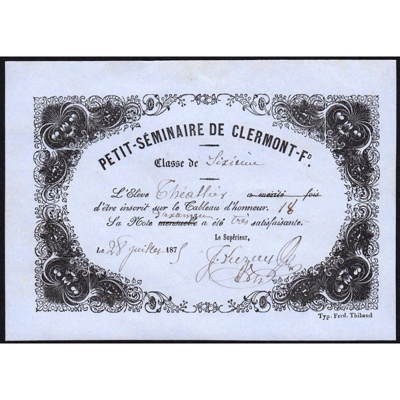 63 - Clermont-Ferrand - Petit-Séminaire - Tableau d'Honneur - 28/07/1875 - Etat : SPL+