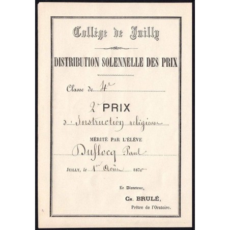 77 - Juilly - Collège de Juilly - Distrib. solennelle des prix - 01/08/1870 - Etat : SPL+