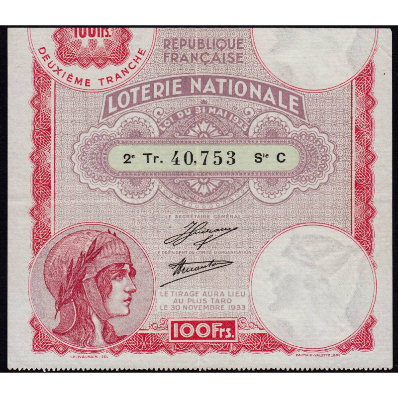 1933 - Loterie Nationale - 2e tranche - Etat : TTB
