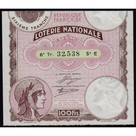 1933 - Loterie Nationale - 6e tranche - Etat : TTB