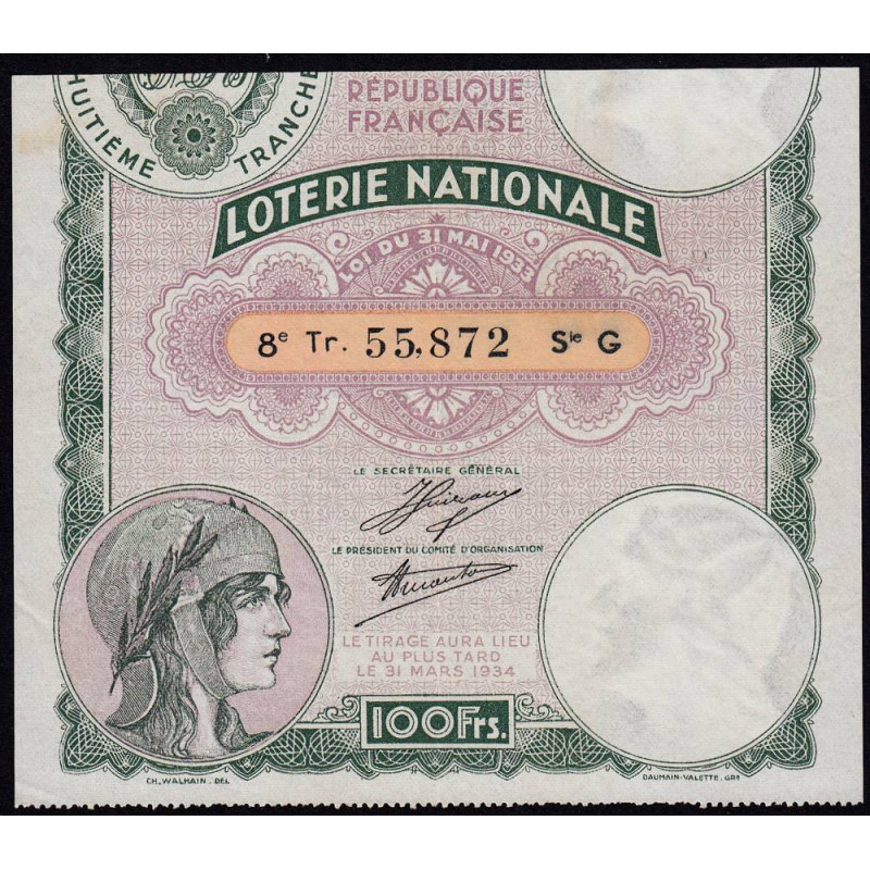 1933 - Loterie Nationale - 8e tranche - Etat : TTB