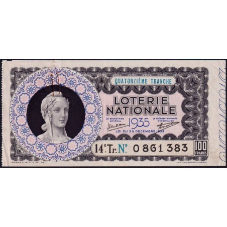 1935 - Loterie Nationale - 14e tranche - Entier - Etat : TTB+