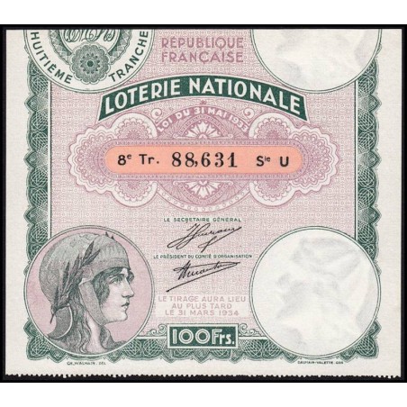 1933 - Loterie Nationale - 8e tranche - Etat : SUP+