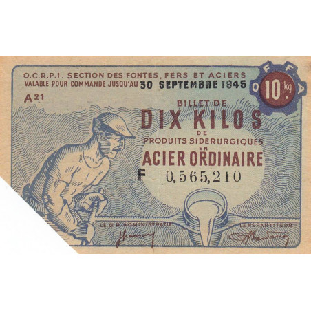 • 10 kg acier ordinaire - 30/09/1945 - Non endossé - Série F - Etat : SUP