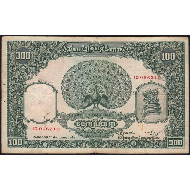 Avers : Au centre un paon (emblème de la dynastie solaire birmane), à droite chinthe (créature mythique protectrice des stûpas et des temples bouddhistes)