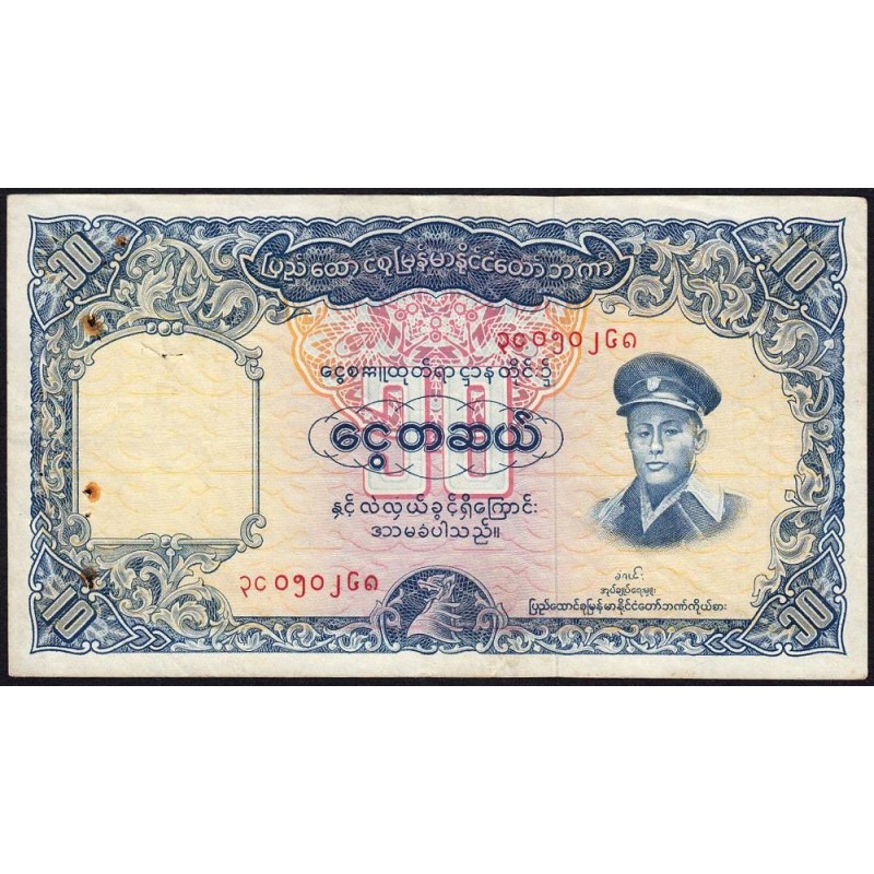 Avers : Portrait du général Bogyoke Aung San (1915-1947), en bas un chinthe (créature mythique protectrice des stûpas et des temples bouddhistes)